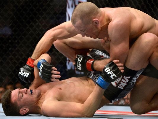 Всё как всегда…по старой схеме…без изменений – вообщем называйте, как хотите то, что происходило в главном бою вечера. Любой вариант подойдёт. Уже вначале схватки чемпион перевёл соперника на канвас и контролировал там. При всей своей агрессии, проломных ударах руками и великолепном бжж, экс-чемпион Strikeforce был просто неспособен защищаться от борьбы. Да и в партере он ничего сделать так и не смог. Сент-Пьер доминировал, но проводя бесчисленное количество бросков, никакого серьёзного урона внизу нанести, не мог. В течение первых трёх раундов Диас напоминал большую плюшевую игрушку, которую кидают по всей клетке из угла в угол и которой усиленно протирают настил. Но был ряд эпизодов, где он в стойке провёл свои двойки очень чётко. Ну и результат на лицо, как говорится. На лицо чемпиона. Сент-Пьер в последних раундах сбавил обороты, и противостояние уже не имело односторонний характер как в начале. Итог всей этой пятираундовой баталии таков, как и ожидали многие. Диас сделал всё что мог, но, учитывая его откровенно слабые навыки борьбы, мог он не так уж и много. Следующий в очереди – бородач. Будем ждать.