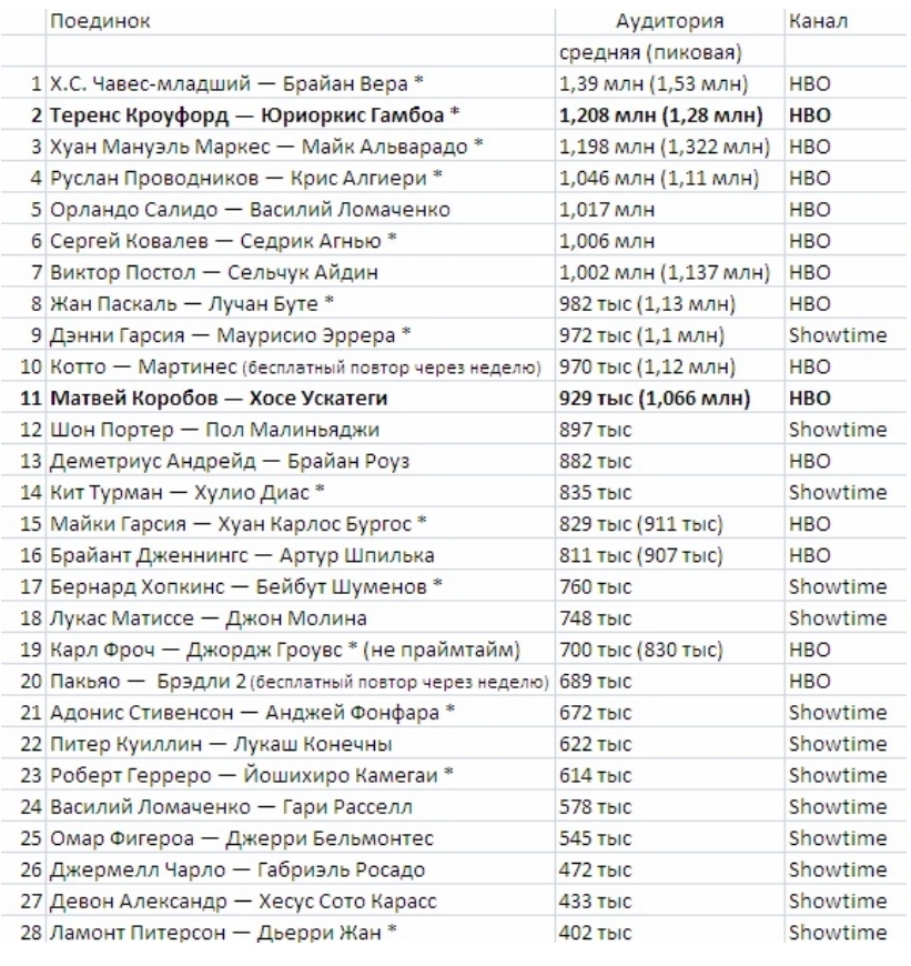 В прошлые выходные в Омахе (штат Небраска, США) состоялось боксерское шоу, в главном поединке которого чемпион мира по версии WBO в легком весе 26-летний американец Теренс Кроуфорд в зрелищном бою одержал победу нокаутом над 32-летним кубинцем Юриоркисом Гамбоа. Аудитория этого поединка, транслировавшегося на телеканале HBO, составила 1,208 миллиона зрителей. На данный момент это второй показатель за этот год. Пиковая аудитория — 1,28 млн.
