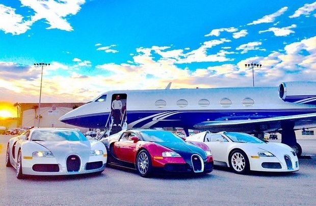 "Добро пожаловать в мой игрушечный мир! Кто хочет попасть в него и немного поиграть?" - поинтересовался у своих подписчиков в соцсети Флойд. Он также добавил, что на фото изображены два автомобиля Bugatti Veyron, каждый из которых стоит $1,6 млн, Bugatti Gran Sport стоимостью $3 млн, два Ferrari 458 Spider (каждый по $360 тыс.), Lamborghini Aventador ($390 тыс.), Porsche 911 Turbo S ($205 тыс.), Ferrari 599 GTB Fiorano ($350 тыс.) и его самолет (оценивается в $40 млн).