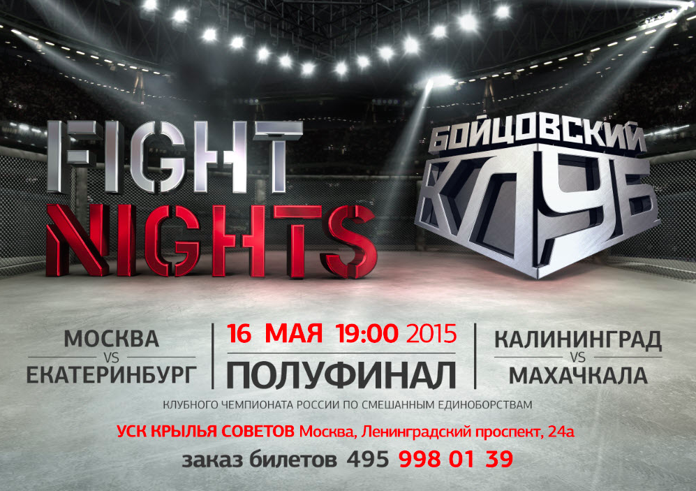 16 мая 2015 года на площадке УСК "Крылья Советов" пройдут полуфинальные бои Клубного чемпионата России по смешанным единоборствам "Бойцовский клуб FIGHT NIGHTS". Борьбу за главный приз 1 000 000 рублей от компании "Bingo Boom" поведут четыре команды. Бойцовский клуб "Крепость" встретится с "Ратиборецем", вторую путевку в финал оспорят "Академия ММА" и "Академия боевых искусств". Также зрителей ожидают четыре рейтинговых боя с участием сильнейших российских бойцов. Начало в 19-00.