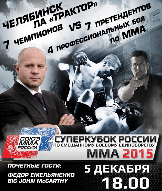 5 декабря на Ледовой арене «Трактор» в Челябинске состоится итоговый и самый престижный турнир по смешанным единоборствам – Суперкубок России по ММА, который пройдет под эгидой Союза ММА России. Победители Кубка России и чемпионата России оспорят право называться лучшими бойцами этого года. В каждой из 7 весовых категорий 7 чемпионов России будут противостоять 7 победителям розыгрыша Кубка России 2015 года.