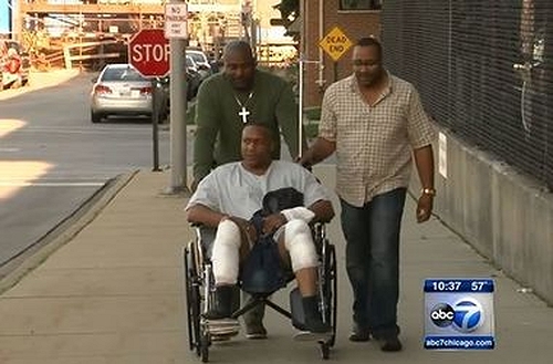 На фото: Данелл Николсон в инвалидной коляске покидает больницу