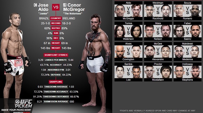 К радости поклонников джиу-джитсу по всему миру, иконы стиля — Демиан Майа и Гуннар Нельсон, наконец, встретятся 12 декабря для того, чтобы разобраться, кто из них является номером один. Победитель, наверняка, так же встанет в очередь на титульный бой. Будущее полулегкого дивизиона, гаваец Макс Холлоуэй, наверное, попытается сделать шоу из боя с крепким орешком в лице Джереми Стивенса, и в случае положительного результата, Макс скорее всего получит титульный бой, ведь это станет его восьмой победой подряд.