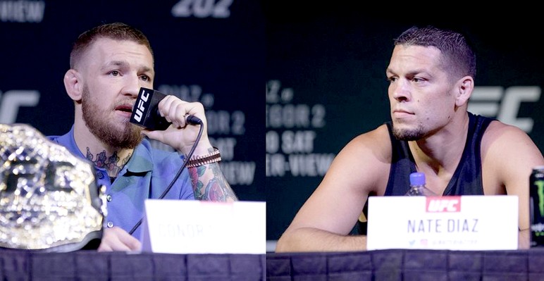 Покидая вместе с командой зал пресс-конференции, Нейт Диас несколько раз показал своему сопернику средний палец, выкрикнув «к черту всю твою команду», а после того, как Конор МакГрегор ответил ему тем же, кинул в действующего чемпиона UFC в полулегком весе бутылку с водой, спровоцировав взаимную перестрелку.