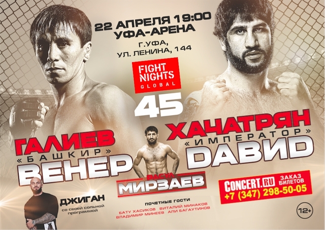В 2016 году FIGHT NIGHTS разыграет чемпионские пояса в трех весовых категориях. На турнире FIGHT NIGHTS GLOBAL 45 зрители увидят первые четвертьфиналы Гран-при в весе до 65.8 кг. В споре за путевку в следующий раунд борьбу поведут молодые проспекты Ахмед Балкизов и Руслан Яманбаев, а также Роман Силагадзе и Самвел Маркосян. Специальный гость турнира - рэп-исполнитель Джиган.