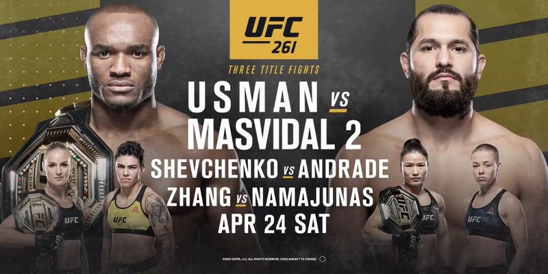 В главной схватке мероприятия сойдутся Камару Усман и Хорхе Масвидаль. Это будет реванш — первый бой выиграл чемпион. В со-главном поединке анонсированного турнира Валентина Шевченко будет защищать свой титул от Джессики Андраде. Кроме этого, фанатов ММА ждет еще одна очень интересная схватка: Вэйли Жанг подерется с Роуз Намаюнас, а на кону тоже будет стоять звание чемпиона промоушена.
