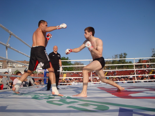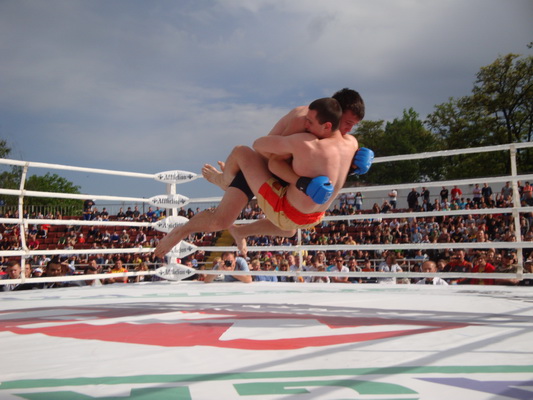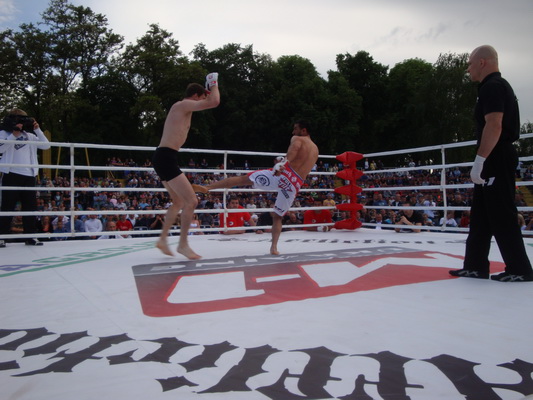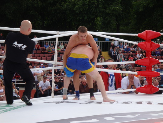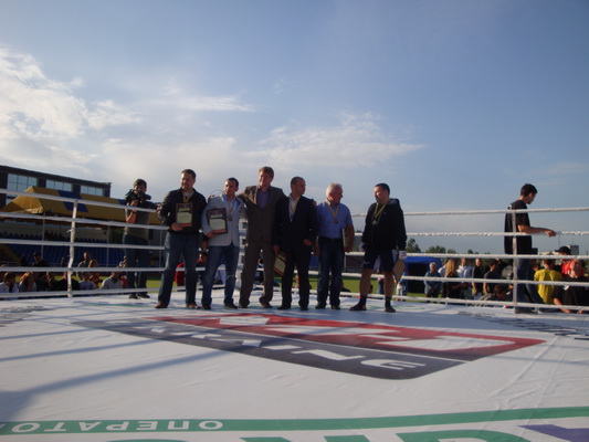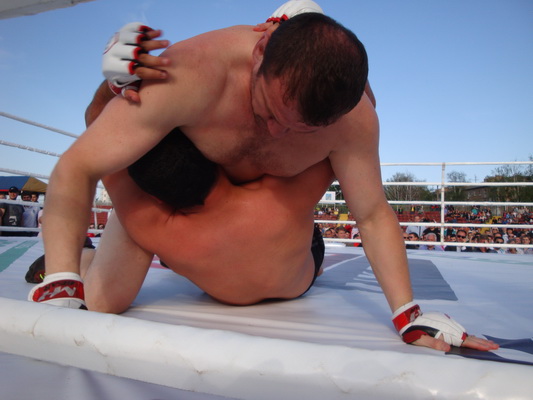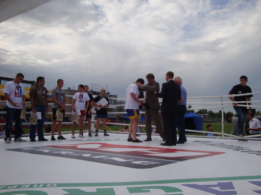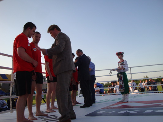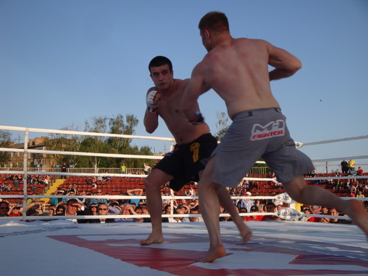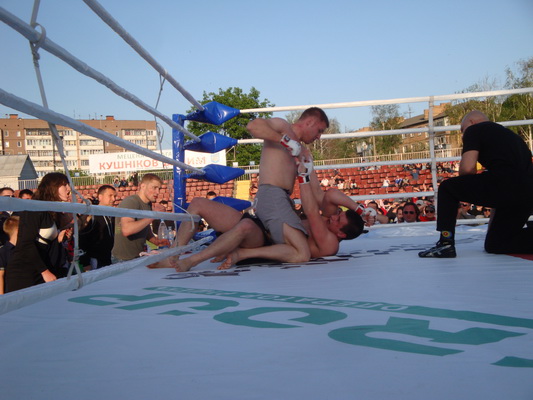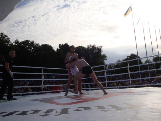 19 мая небо над бориспольским стадионом «Колос» было изменчиво, хотя после обеденное время уже ничто вроде не предвещало дождя. Однако с началом первого финального боя (в весовой категории до 65 кг) чемпионата Украины по смешанным единоборствам солнце скрылось и легонько стал мороситы свежий дождь.
