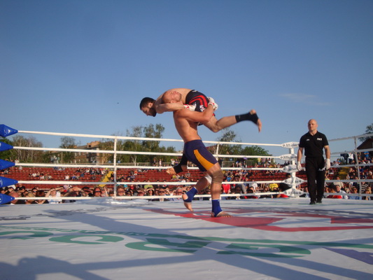 В весе до 77 кг встречаются хмельничанин Виталий Добровольский, который чуть больше часа назад малой кровью выиграл звание чемпиона Украины, и Юрий Григорян из Беларуси. Очень медленно под свою мелодию выходит на ринг белорусский боец, он выглядит чрезвычайно заряженным.Не менее заряжен и Виталий, который сегодня победил не одного соперника и собирается поставить этим поединком жирную точку в соревновательном дне. С левым боковым ударом в голову входит в ближнюю дистанцию ??Добровольский, после чего входит в корпус соперника и красиво его бросает.