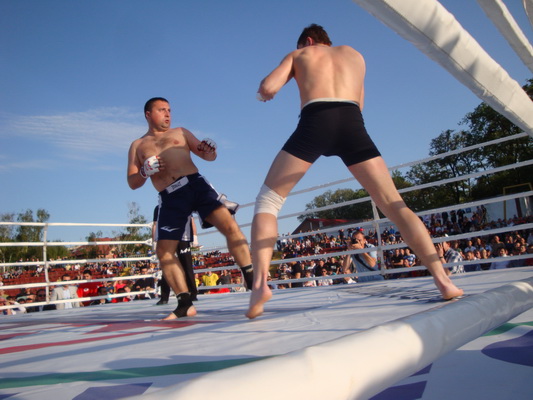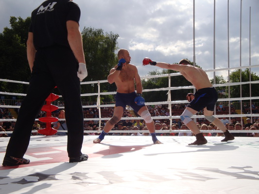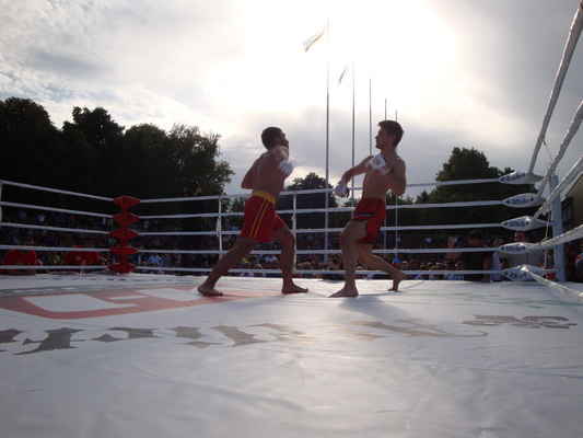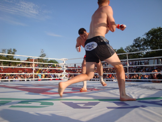 Ринг протирают, и дождик понемногу прекращается, когда туда выходила вторая пара финалистов, киевлянин Андрей Витвицкий и Константин Агапов из команды Хмельницкой области. Осторожно передвигаются по, хотя вытертому, но еще скользком ринге бойцы и первый раунд проходит в разведке: Агапов пытается сближаться, а Витвицкий осторожно отступает.На близкой дистанции бойцы почему-то входили в безнадежный клинч.