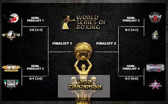 Кроме того, число полуфиналистов пополнили действующие чемпионы Всемирной серии бокса команда Казахстана "Астана Арланс" разгромившие немецкую машину и "Кубинские укротители" без труда расправившиеся с "Американскими нокаутами".