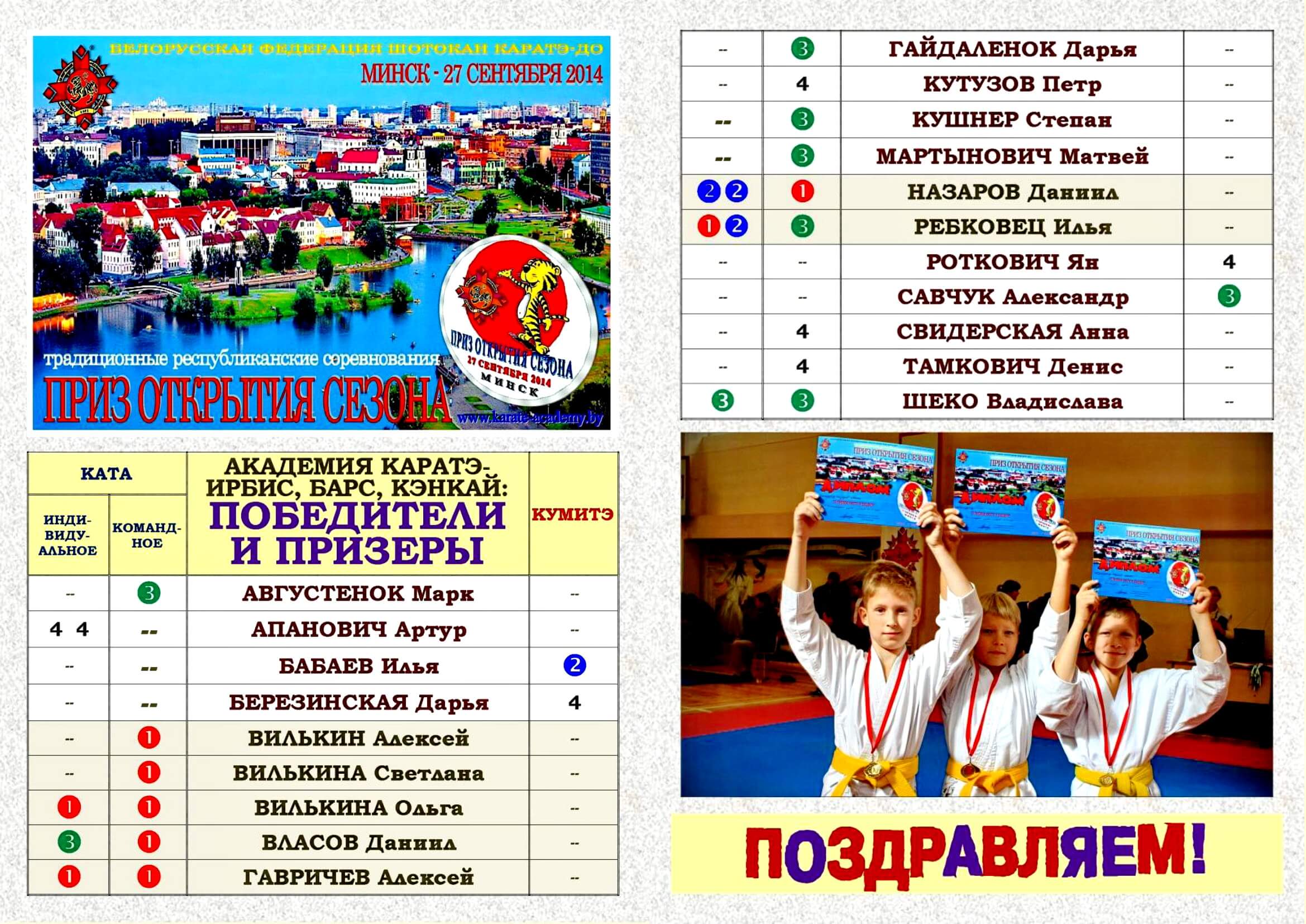 В заявке от минской Академии каратэ были представлены 28 спортсменов, для некоторых "Приз открытия сезона" стал уже третьим стартом в нынешнем учебном году. По результатам спортивной борьбы двадцать наших участников принимают , занятые на этих представительных и престижных соревнованиях. Большинство из них готовятся к выходу на польские татами. Пожелаем им, как и всей белорусской сборной, успеха - возвращайтесь с победами!