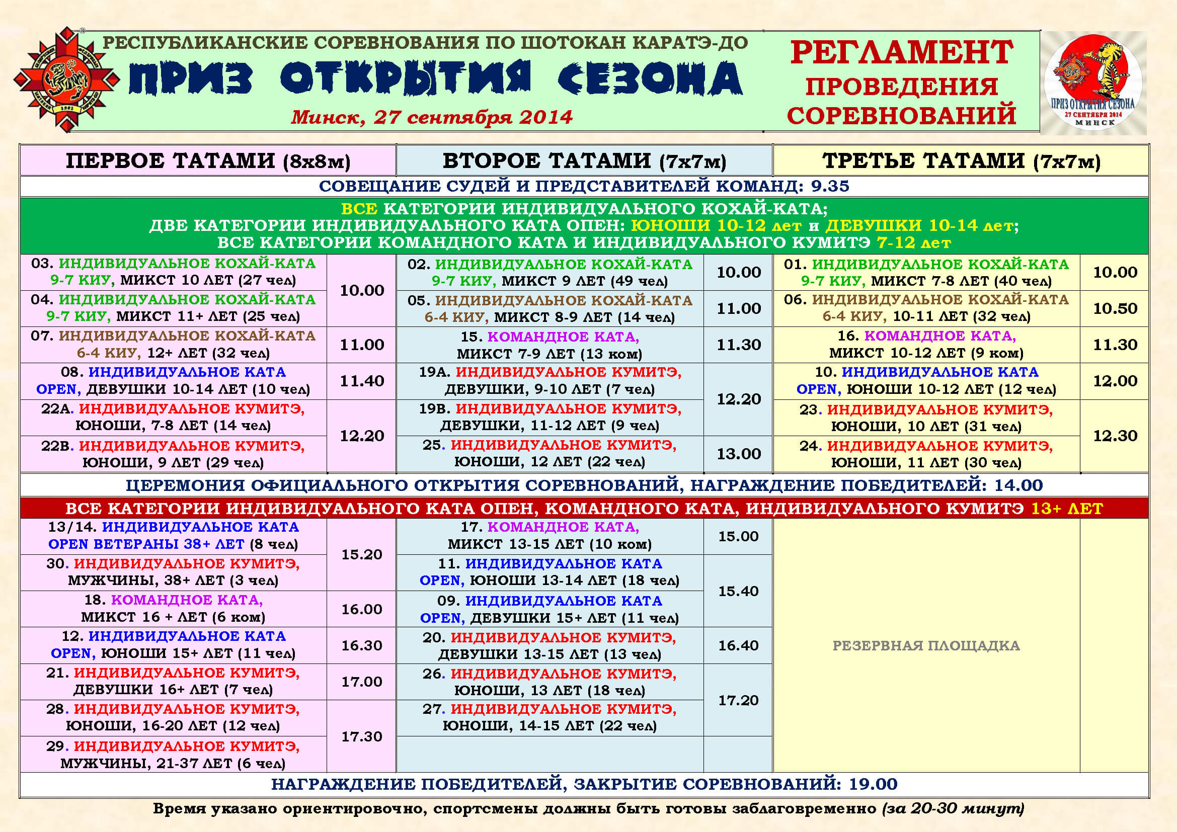 Традиционные соревнования "Приз открытия сезона" проводятся Белорусской федерацией шотокан каратэ-до в начале нового учебного года уже около 20 лет (информация о состоявшихся в последние годы турнирах доступна на нашем сайте: , и ). В нынешнем году они состоялись на спортивной базе средней школы №138 Минска. Выражаем благодарность за организационную поддержку по проведению соревнований представителям клуба Феникс/Минск (А. М. Норейко, М. В. Митенков), а также предоставившим татами клубам Бассай/Волковыск (А. Н. Гаврильчик, В. И. Миронь) и Сайва-ПолесГУ/Пинск ( П. М. Бабич-Островский).