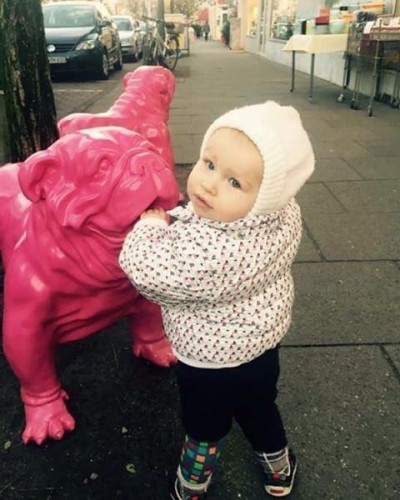 На снимке Кайя-Евдокия позирует возле игрушечной розовой собаки.