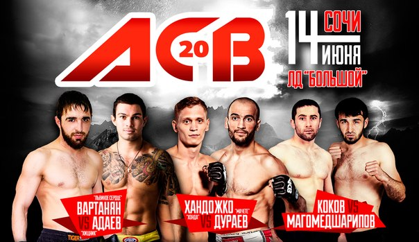 «14 июня пройдет двадцатый турнир бойцовской лиги ACB в городе Сочи. На этом турнире придут полуфиналы гран-при лиги АСВ в трех весовых категориях: до 65,8 кг, до 70,3 кг и до 77.1 кг. Все бои обещают быть жаркими, потому что лига АСВ — это всегда высокий уровень качества боев. Однако особенно стоит выделить три поединка. В главном бою сойдутся Альберт Дураев и Сергей Хандожко, и этот поединок достоин носить звание титульного. Во втором по значимости событии вечера выступят два мощных ударника Эдуард Вартанян и Амирхан Адаев, а так же зрители увидят противостояние между перспективным Мухаммедом Коковым и Забитом Магомедшариповым. Только за год география турниров ACB уже охватила крупнейшие российские города, и турнир в Сочи очередное тому подтверждение».