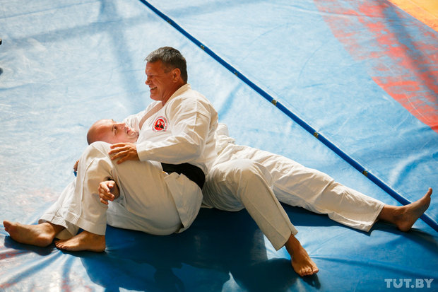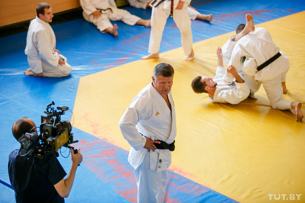 Режиссер то и дело отрывается от разговора и наблюдает за съемочным процессом, комментируя игру актеров и раздавая советы. Те бросают друг друга на татами и проводят болевые приемы.