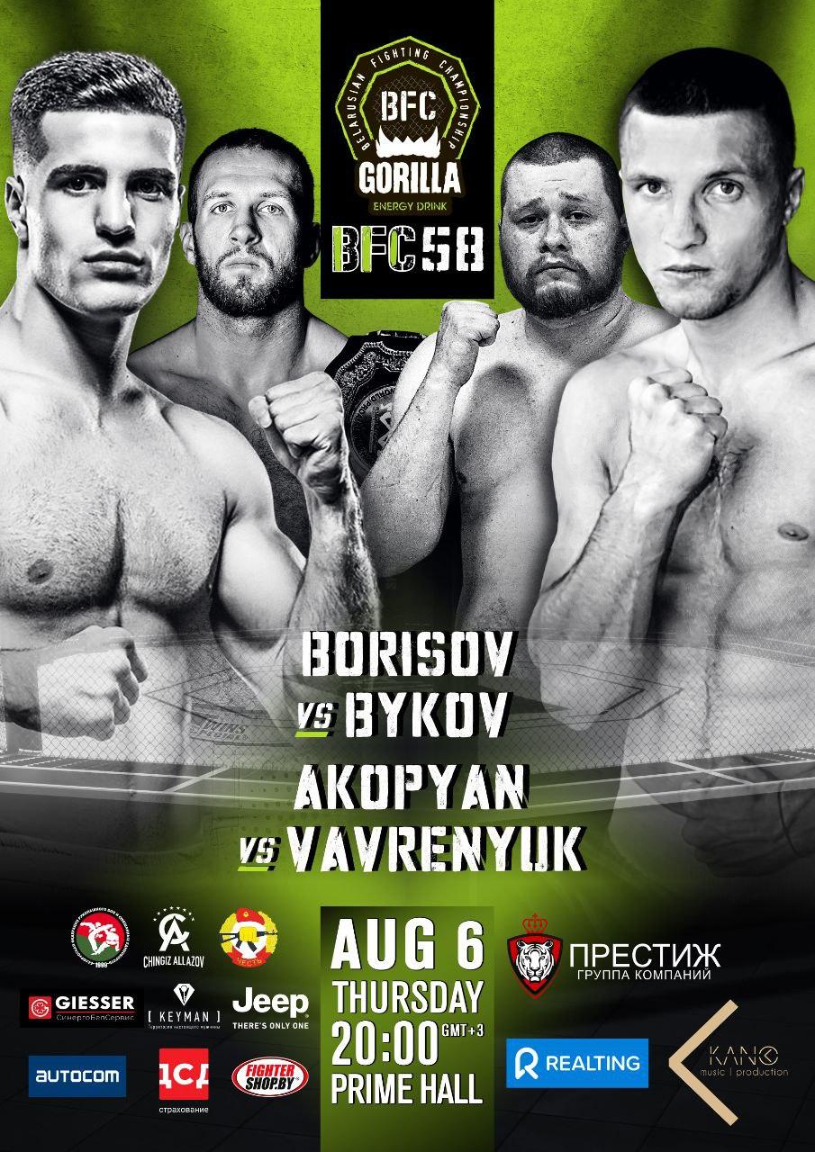 В главном бою вечера, по правилам MMA, любители единоборств увидят бой между сильным бойцом из Беларуси – Юлианом Борисовым (5-4) и перспективным бойцом из России – Виталием Быковым (1-0).