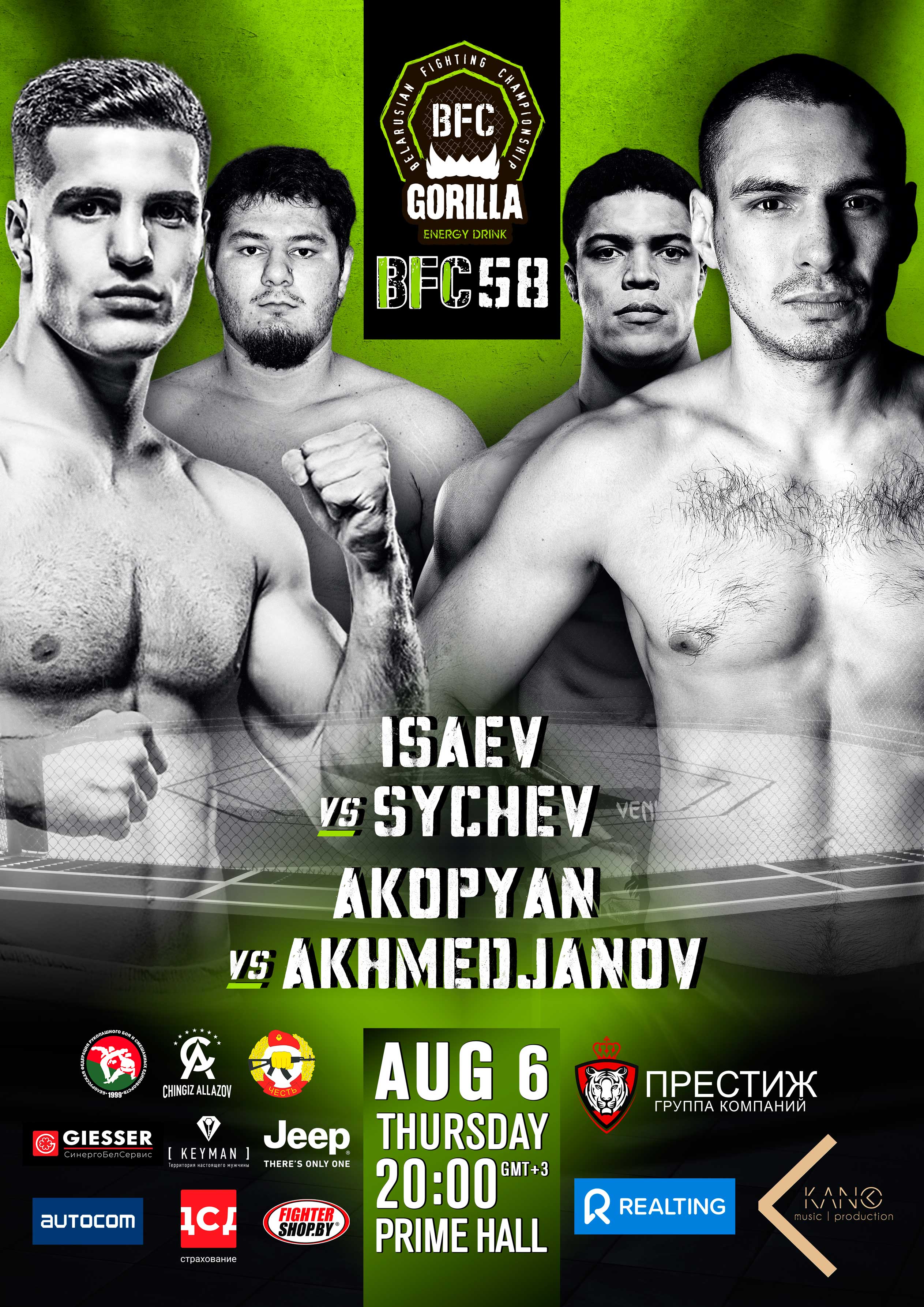 В главном бою вечера, по правилам MMA, любители единоборств увидят бой между непобежденным бойцом из России – Рамазаном Исаевым (3-0) и перспективным бойцом из Беларуси – Марселем Сычевым (1-0).