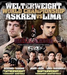Предлагаем вашему вниманию результаты турнира Bellator 64, который состоялся сегодня в Виндзоре, Канада. Напомним, что возглавлял турнир титульный бой между действующим чемпионом Беном Аскреном и Дугласом Лимой.