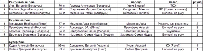 В весовой категории до 70кг. встретились чемпион РБ по тайскому боксу Улич Виталий и призер РБ по грепплингу Гармаш Александр. Победу техническим нокаутом одержал Улич Виталий.