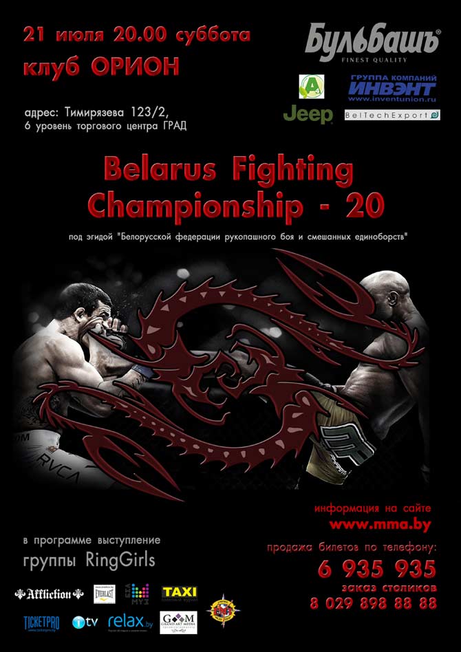 Предлагаю Вашему вниманию файт кард Belarus Fighting Championship «BFC-20» гран-при Орион, который пройдет в Минске 21 июля в клубе «Орион»