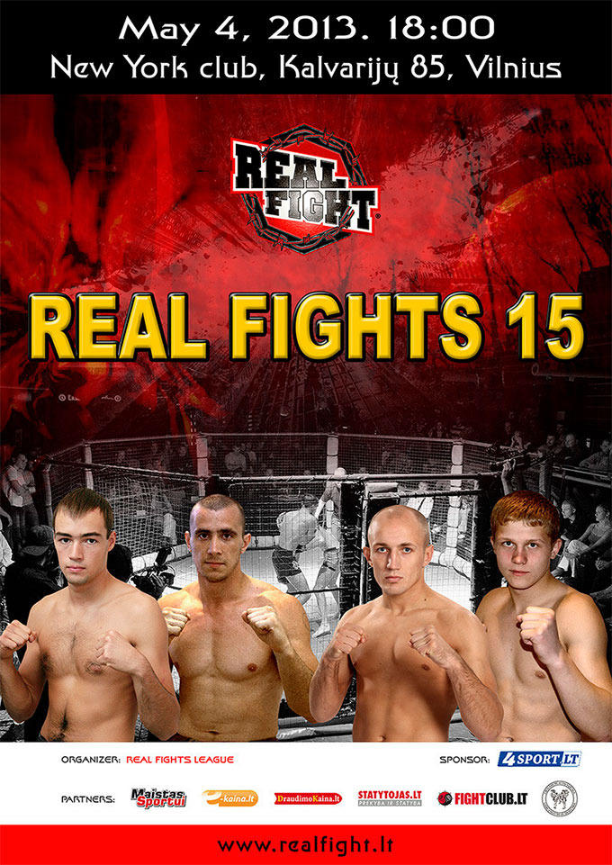 4 мая в Вильнюсе пройдет турнир по смешанным единоборствам «Real Fights 15″. В главных боях по профессиональным правилам ММА встретиться Сергей Гречихо (Литва) Артем Казерский (Беларусь) и Эдвардас Норкелюнас (Литва) Алексей Репалов (Беларусь). Всево в турнире пройдет 13 поединок по правилам ММА, муай-тай и К-1.
