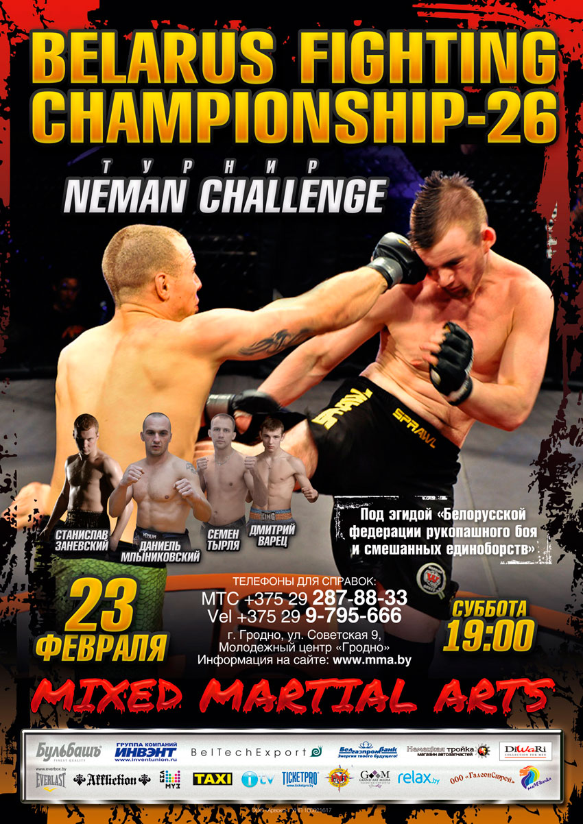 Предлагаю Вашему вниманию афишу турнира Neman Challenge «BFC-26», который пройдет 23 февраля в 19:00, в Молодежном центре «Гродно» (г.Гродно)