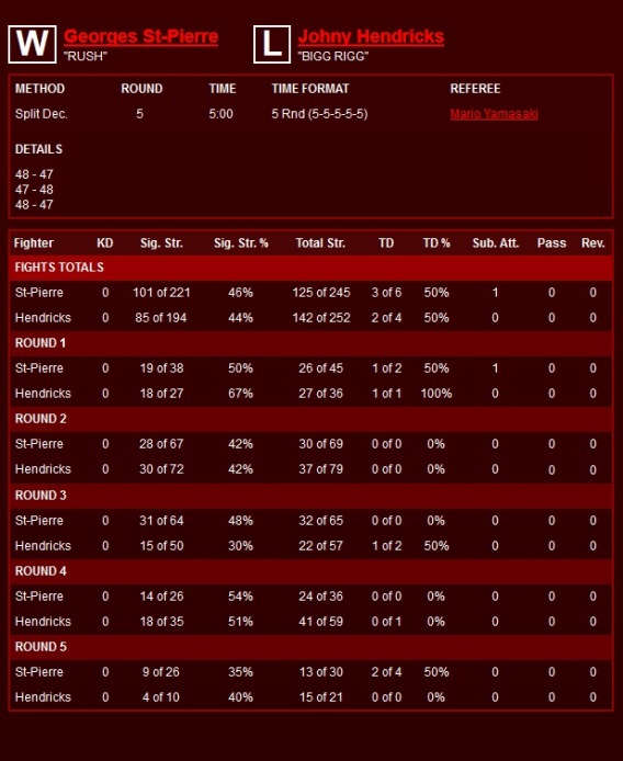 Вопреки убеждению многих, сухая статистика подтверждает правоту судей: на бумаге Джордж Сент-Пьер (25-2) выиграл поединок с Джони Хендриксом (15-2), хоть и с минимальным отрывом. Впрочем, о количестве нанесенного урона эти цифры ничего не говорят, а в этом аспекте Хендрикс явно обошел чемпиона.