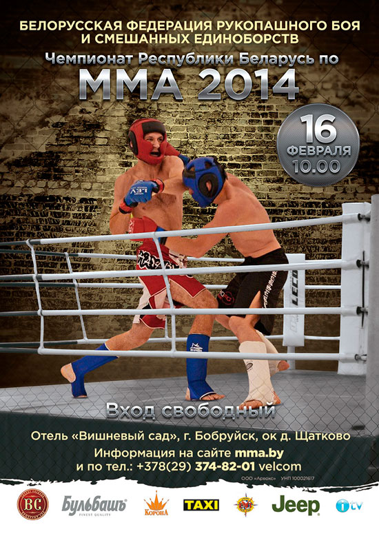 Предлагаем вашему вниманию афишу чемпионата Республики Беларусь по смешанным единоборствам, который пройдет с 15 по 16 февраля в усадьбе “Вишневый сад” под Бобруйском.