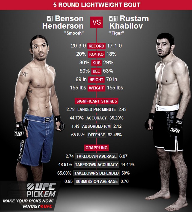 Рустам Хабилов выиграл все три боя, проведенные под эгидой UFC. В бою с Хорхе Масвидалем он продемонстрировал разнообразную ударную технику, доказав, что является не только лишь талантливым борцом. Рустам – молод, заряжен и агрессивен. Серьезные опасения вызывает лишь то, что Хабилов ни разу не проводил бои, длительностью в 5 раундов. Бенсону Хендерсону, напротив, хватает опыта затяжных боев. Последний раз он заканчивал бой досрочно в январе далекого 2010 года. В последнем бою, с Джошем Томпсоном, Хендерсон показал старого доброго себя – любителя набирать очки и выигрывать судейскими решениями. Главный козырь бывшего чемпиона – выносливость и способность поддерживать постоянный прессинг на протяжении всего боя. Команда Хендерсона почти наверняка выберет план на бой, который им не удалось осуществить в бою с Петтисом – постоянно давить на соперника, клинчевать, прижимать к сетке, изматывая его, и не давая маневрировать. Ключ к победе для Рустама – в разнообразии. Ему придется продемонстрировать весь свой арсенал, фактически – Рустаму нужно удивить Хендерсона.