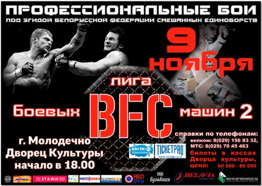 9 ноября в Молодечно под эгидой «Белорусской федерации рукопашного боя и смешанных единоборств» состоится профессиональный бойцовский турнир по смешанным единоборствам BFC «Лига боевых машин 2». Предлагаю Вашему вниманию постер турнира.