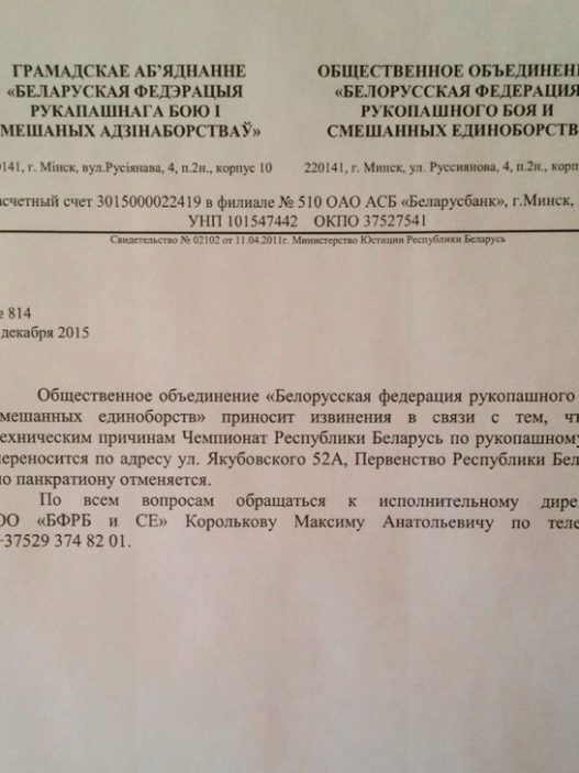 Первенство Республики Беларусь по панкратиону отменяется. Чемпионат Республики Беларусь по рукопашному бою переносится Новости отДмитрий Захаров