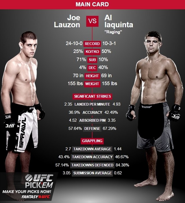 Любимец публики и ветеран UFC Джо Лоузон (24-10), сразится с восходящей звездой Алом Яквинта (10-3-1). Поединок представляет интересное столкновение двух разных стилей.