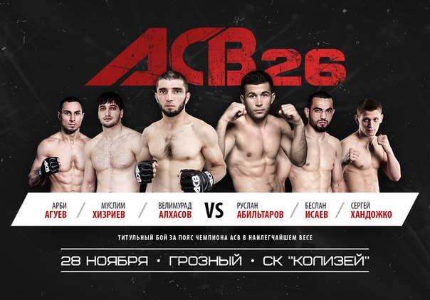 28 ноября в Спорт Холле «Колизей» в городе Грозный пройдет 26-й турнир АСВ, финал Grand Prix 2015 года по смешанным единоборствам. В этот вечер зрителей ждет рекордное число поединков между сильнейшими профессионалами. Традиционно сильный файткард, подготовленный международным промоутером Absolute Championship BERKUT, обещает болельщикам невероятный накал страстей в октагоне.