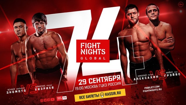 Предлагаем вашему вниманию результаты турнира FIGHT NIGHTS GLOBAL 74, который состоялся 29 сентября 2017 года на арене ГЦКЗ «Россия» в Москве.