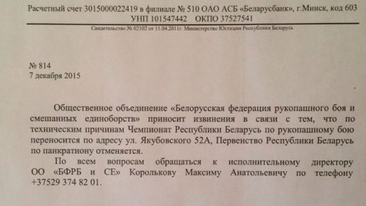 Первенство Республики Беларусь по панкратиону отменяется. Чемпионат Республики Беларусь по рукопашному бою переносится Новости 8 декабря, 2015 отДмитрий Захаров