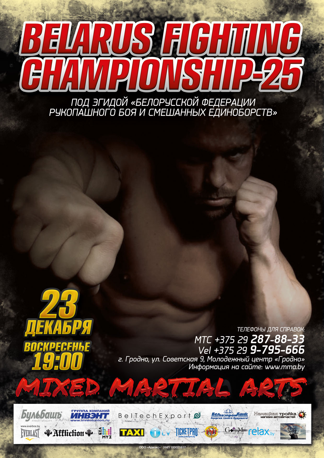 23 декабря в 19:00, в Молодежном центре "Гродно" (г.Гродно) состоится очередной турнир Белоруского бойцовского чемпионата «BFC-25» (Belarus fighting championship - 25) под эгидой "Белорусской федерации рукопашного боя и смешанных единоборств".
