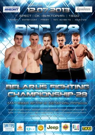 "Belarus Fighting Championship - 28", турнир по ММА под эгидой "Белорусской федерации рукопашного боя и смешанных единоборств", а так же благотворительного фонда Память Афгана пройдет 12 июля 2013 в 19.00 в Спортивном Комплексе “Виктория” г. Брест. В рамках турнира состоится профессиональная матчевая встреча по ММА между командами Польши и Беларуси.