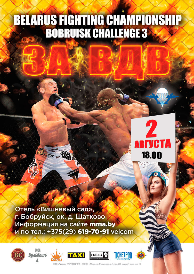2 августа в этом году знаменательно не только великим праздником - Днем десантника, но и настоящими мужскими боями. В субботу 2 августа 2014г. состоится очередной турнир по смешанным единоборствам BFC - BOBRUISK CHALLENGE 3, который пройдет под девизом «За ВДВ» где примут участие лучшие бойцы ММА Беларуси.