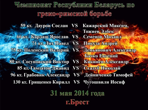 30-31 мая в Бресте пройдет чемпионат Республики Беларусь по греко-римской борьбе. В этих соревнованиях примут участие сильнейшие борцы греко-римского стиля нашей страны. Соревнования пройдут по адресу: Брест, ул. Ленинградская 4, дворец игровых видов спорта "Виктория".