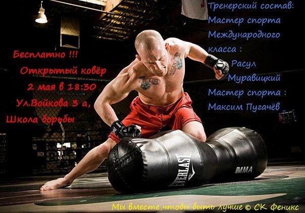 Внимание! 2 мая (суббота) в 18:30 клуб смешанных единоборств "Fenix" города Барановичи проводит открытый ковёр для всех желающих попробовать себя в этом виде единоборств, а так же почерпнуть что-либо новое, пообщаться со спортсменами и т.д. Семинар будут проводить лучшие бойцы Беларуси, неоднократные мастера спорта, тренера клуба "Fenix": Расул Муравицкий и Максим Пугачёв. С собой брать лишь спортивные штаны и майку!