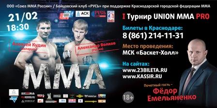 21 февраля в Краснодаре (Россия) состоится турнир по правилам ММА. В главном поединке вечера в клетке сойдутся Алексей Кудин (Беларусь, Минск) и Александр Волков (Россия, Москва). Поединок обещает быть очень интересным! Алексей в последних поединках показал хорошие результаты, в том числе можно вспомнить последний победный бой с Андреосом Краниотакесом. Между тем Александр является официальным претендентом на титул в организации Белаттор. Почетный гость мероприятия - Федор Емельяненко. Предлагаем вашему вниманию файт-карта турнира.