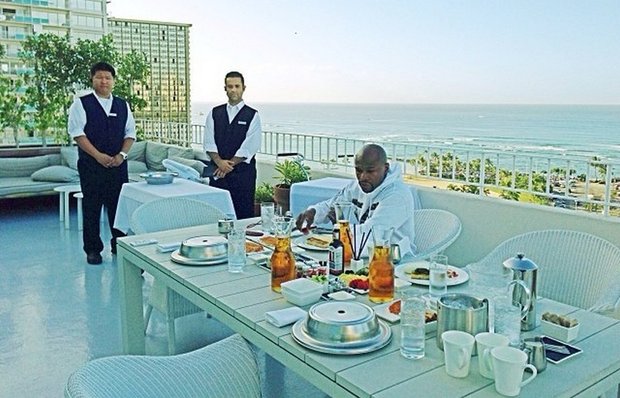 А вот так выглядел завтрак Мэйвезера в президентском номере гостиницы на Гавайских островах.