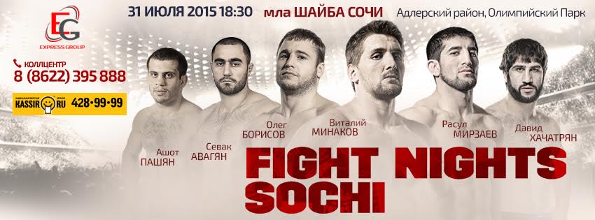 Еще свежа в памяти зрителя яркая победа российской сборной на Олимпиаде в Сочи, а смешанные единоборства уже спешат занять свое место в спортивной жизни этого славного города. Промоутерская компания FIGHT NIGHTS и телеканал "Россия 2" представляют международный турнир по смешанным единоборствам "FIGHT NIGHTS SOCHI". Спортивно-светское мероприятие пройдет 31 июля 2015 года на арене "Шайба" в Олимпийском парке города Сочи. Начало турнира в 18-30.