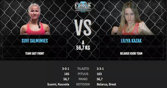 16 мая состоялся турнир - один из самых популярных скандинавских турниров. В турнире приняла участие Лилия Казак (3-3-1), выступающая за спортивный клуб "Кудо" (Беларусь). Ее соперница - топовый финский проспект Суви Салмимиес, занимающая первую строчку в скандинавских рейтингах с рекордом 3-0-1 и не имевщая пока поражений в профессиональном ММА.