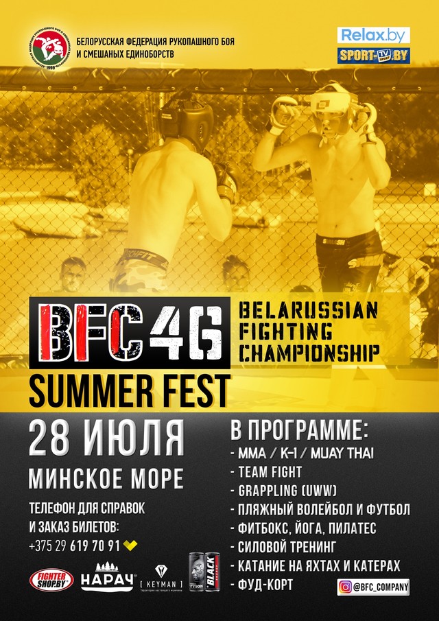 BFC 46 SUMMER FEST – это ярчайший турнир по единоборствам на берегу Минского моря на территории Центра парусного спорта. Минское море – одно из живописнейших мест, где пройдут бои по правилам MMA, K1 и MUAY THAI.