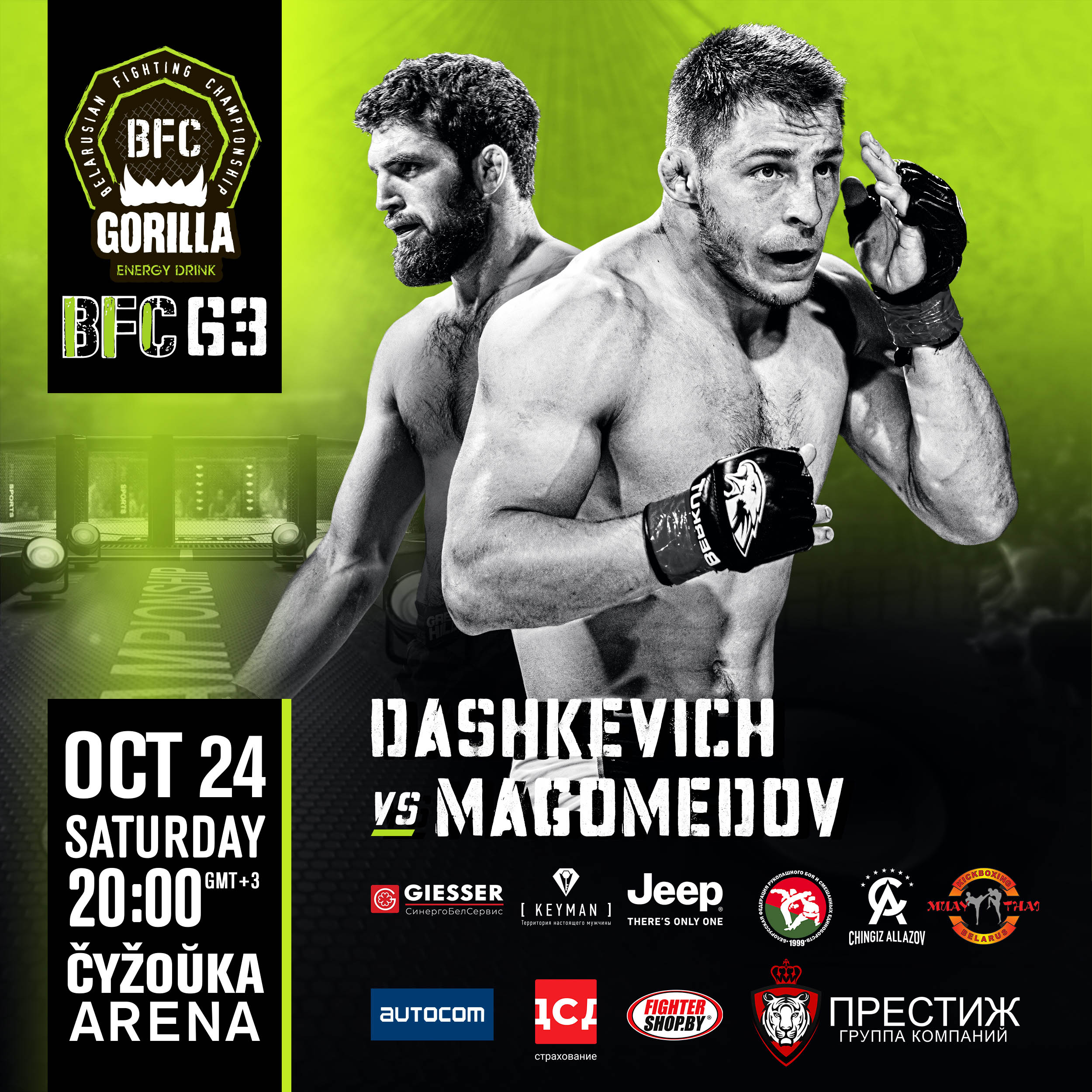 В главном бою по ММА, любители единоборств увидят бой за пояс Чемпиона BFC в весовой категории до 70,3 кг (Lightweight), между Валерием Дашкевичем (5-2) и Магомедом Магомедовым (2-0).