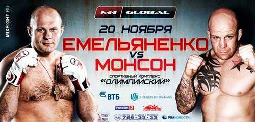 20 ноября в Москве в СК "Олимпийский" пройдет грандиозный турнир по смешанным единоборствам, проводимый компанией M-1 Global. В главном бою вечера Федор Емельяненко (31-4) сразится с американцем Джеффом Монсоном (42-12)